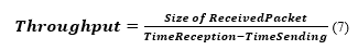Throughput: it measures the flux or the quantity of data traveling over a communication channel per unit time, usually expressed in bits per second or packets per second. We use the following equation (7) to calculate the average throughput:![]()