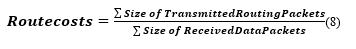 Route-costs is calculated by dividing the total number of bytes of the routing packets that (includes forwarded routing packets and control packets as well) and the total amount of the received data (see equation (8)).![]()