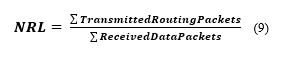 Normalized routing Load (NRL) defined as the total number of routing packets transmitted per data packet. It calculated by dividing the total sum of routing packets that sent (includes forwarded routing packets as well) by the total number of data packets received as follows in below equation (9):