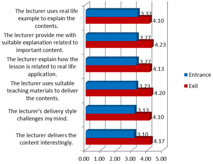 From the survey, we also measured lecturer’s ability in teaching the subject from the students’ point of view and the statistic is depicted as in Figure 9 below. The mean scores in exit survey are higher than the entrance survey. Majority of the mean scores for all questions in this criteria are higher than 4.00. This indicates that the students felt that the lecturer is capable of teaching this subject.