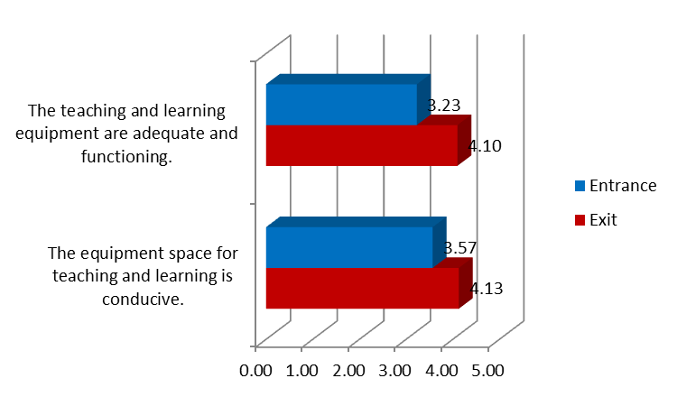 Other than that, the students gave positive response towards the facilities provided during the module session. Figure 11 below shows the statistic of the criteria. The mean scores for equipment space (mean = 4.13) and functionality (mean = 4.10) are higher in the exit survey compared to entrance survey.