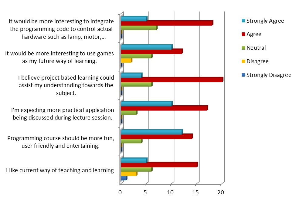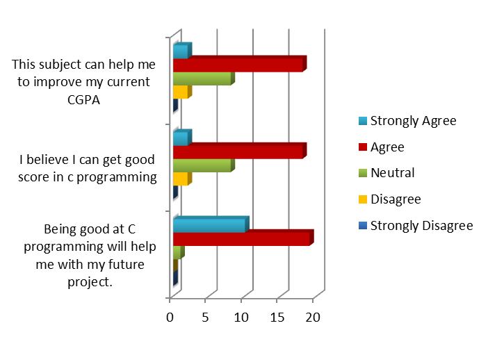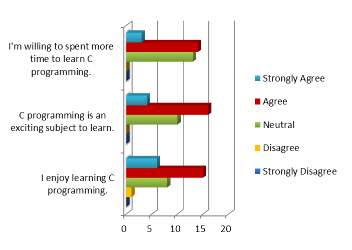Figure 13 shows the bar graph for Criteria Motivation and Students’ interest toward the C Programming. The highest score from this criterion was ‘Agree’ for all three questions and this shows that they are motivated and interested in learning C Programming.