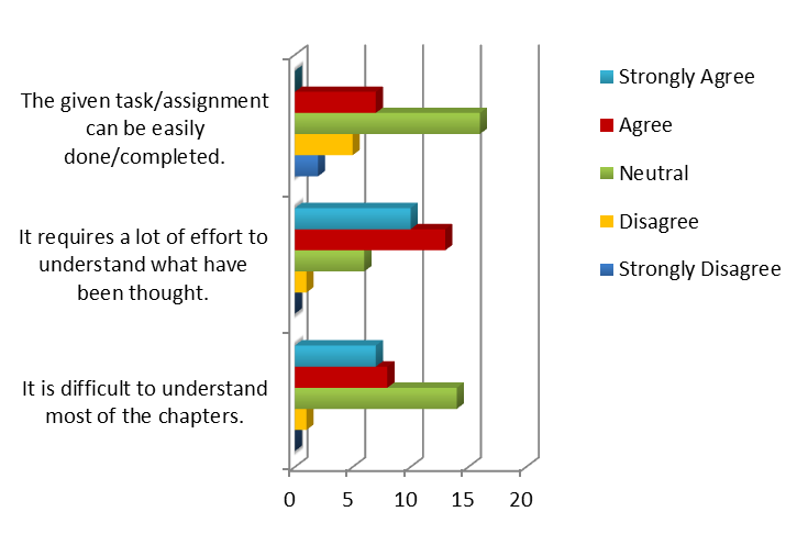 Figure 14 describes the difficulty of the course from the students response. Majority of the students found that the course was quite challenging which they were struggling to understand and complete the task given.