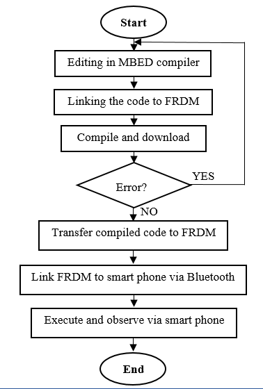Figure 2 depicts the overall programming process carried out during the training session. Participants were taught to write a program code using a web-based MBED compiler. The software can be used to write and edit a program code using high-level languages such as C and C++. Next, a linking process was carried out in which the written code was linked to FRDM-KL05Z controller board or any hardware platform supported by the compiler. After that, the code was compiled and a binary machine code was generated should there be no syntax error. Next, the compiled code was transferred to the board via mass storage device (MSD) flash programming interface. Subsequently, a communication link between the FRDM board and a smart phone was established via HC05 Bluetooth module so that students can observe their program simply through their own smart phones.