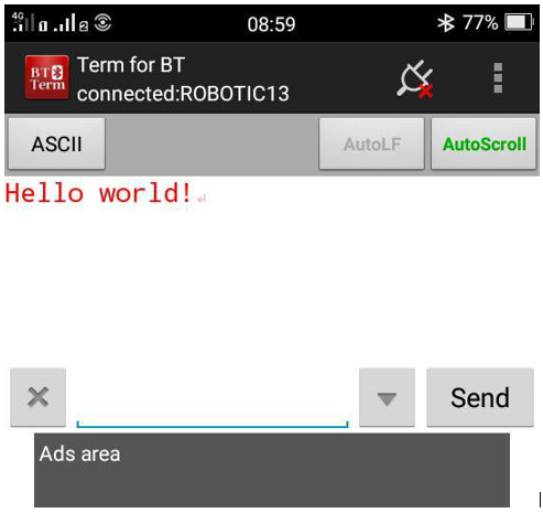 In the first module, the participants were taught to observe the execution of their program via smartphones using a Bluetooth serial application known as “BT Term” developed by Futaba Inc. A printf() statement was used to output a “hello world!” sentence via the Bluetooth application as depicted in Figure 4.