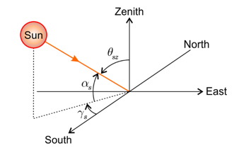 In the Figure 1 are shown the angles , and , where the latter angle is the solar zenith angle. is the angle between the direct sun rays and the horizontal plane of the specific location, when the sun is on the horizontal plane, when the sun is at the zenith. During the sun hours this is an angle between and . Its value is negative before sunrise and after sunset. The relationship between the solar altitude angle and solar zenith angle is . is the angle between the south and the projection of the direct sun rays on the horizontal plane. This is an angle between and . Displacements east of the south are negative and west of the south are positive.