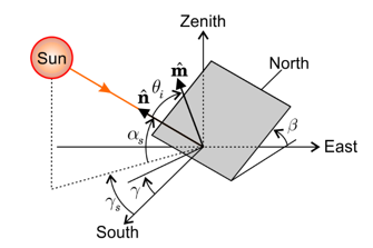 In a fixed location, the sun moves across the sky along the day. By this reason, the beam radiation vector will make an angle with respect to the normal of the collector surface. Most solar energy can be captured when . If a unit vector is pointing from a fixed point in the Earth to the direction of the beam radiation and another unit vector is normal to the collector surface, the angle between both vectors can be computed with the dot product, i.e., .