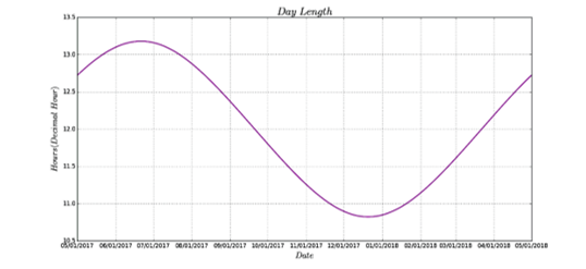 In the figure 6 the yearly evolution of is presented. The shortest day length will be in December 21st, 2017 and it has a value of 10 h and 49 min. It is not surprising that this date corresponds to the winter solstice. The day length reaches a maximum value of 13 h and 10 min. This will happen in June 21th, 2017, which corresponds to the summer solstice.