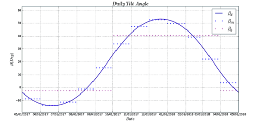 - To estimate the tilt angle that should follow one single axis tracking system in different periods of time. This can be done every six minutes, daily, monthly or biannual. To have an insight of the energetic gain that can have any of the above systems.