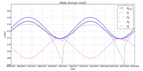 In the Figure 8 are shown the values of , and , which were obtained averaging . This angle was calculated in steps of 0.1 h. The simulation was made by choosing the daily time interval as .As it can be seen in the figure 8 from April 23th to August 18th the daily tilt angle must be negative. It means that during this period the solar collector must face to the north. When a monthly adjustment of the tilt angle is realized, the panel should face the north from May to August. As well as from April to September. In the Figure 9 it is shown how is varying during an entire year in terms of the angles , , , and , where .