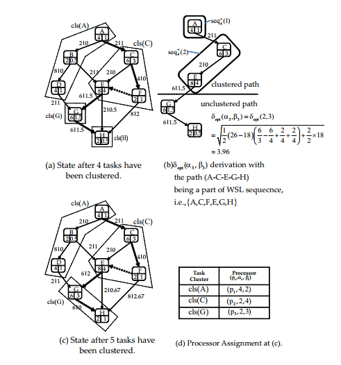 been clustered. the path (A-C-E-G-H) being a part of WSL sequecnce, i.e., A,C,F,E,G,H { } (c) State after 5 tasks have (d) Processor Assignment at (c). been clustered. |