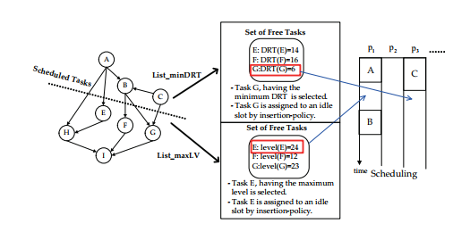 where tf (ni, pp) is the finish time of ni on pp, and nj on pq is supposed to reveive the data from ni on pp. We shall call the ordering method as “List minDRT”.
