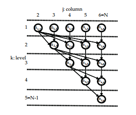 As for the DAG structure, we consider one task as a second inner loop, i.e., for(j = k + 1; j ≤ N; j ++) at the kji Gaussian elimination without pivoting. That is, the same as the one in Section 5.5.1. Fig. 4 presents one example of Gaussian elimination DAG at N = 6. According to the study in [19], the processing time of a task nk,j and the communication time of a data point c(e(k,j),(k+1,m)) are defined as follows: