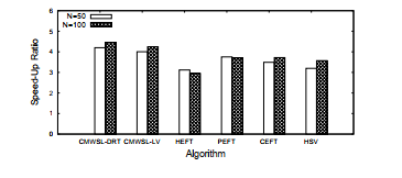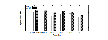 N = 100. CMWSL-DRT and CMWSL-LV outperform the other algorithms in both cases (N = 50 and N = 100). We can see that PEFT, CEFT, and HSV output a smaller schedule length than HEFT. In the real environment, the setup time is nonzero for each processor, and therefore the communication time can have a greater effect on the schedule length than in the simulation. Even in such a case, both CMWSL-DRT and CMWSL-LV have a smaller schedule length than the other algorithms. As for the comparison between CMWSL-DRT and CMWSL-LV, it is observed that CMWSL-DRT outputs better speed-up ratio. In CMWSLLV, a task, e.g., nk by which WSL is obtained if it is scheduled as late as possible, is selected from the free list. However, even if nk is selected, the actual schedule length cannot be made smaller if nk is not a critical task, i.e., nk does not belong to the actually dominating execution path in terms of the schedule length. In CMWSL-DRT, selecting a task having the minimum DRT can lead to the actual schedule length; that is, scheduling a task, e.g., nk having the minimum possible start time can reduce the data waiting time from nk. As a result, the total idle time for each processor can be suppressed.