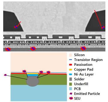 Figure 3. Schematic view of the interaction between particles emitted from the solder with the transistor level.