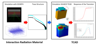 A Monte Carlo simulation using GEANT4 to determine the path of the particles through the transistor as well as the deposited energy was carried out. This data was then used to determine the generation rate for electron hole pairs (3.6 eV) and the radial distribution. The radial distribution is energy-dependent and complex analytical models can be used for their determination [16]. In the following simulation with the TCAD Tool SILVACO, the resulting characteristics can then be determined. In Figure 4 the simulation flow in terms of radiation using GEANT4 and SILVACO TCAD is shown.
