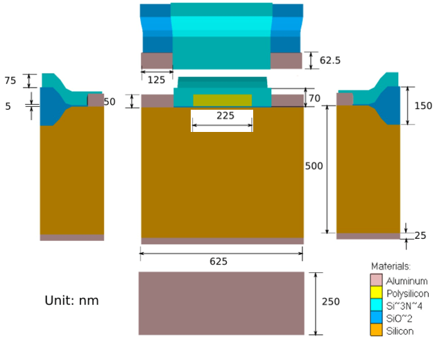 With SILVACO TCAD the behavior of a transistor after SEU exposure with different energies as well as different LET Doses and a radius of 5nm with a cylindrical way through the transistor were calculated. In Figure 7 the dimensions of the transistor is shown.