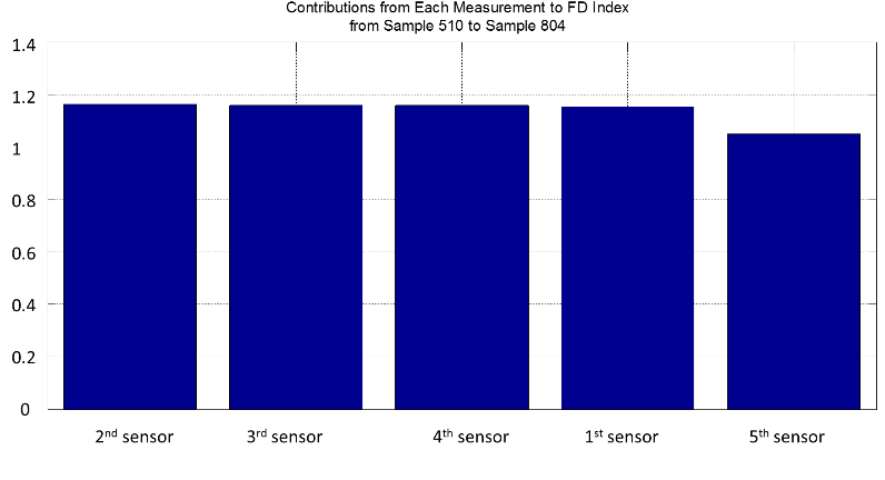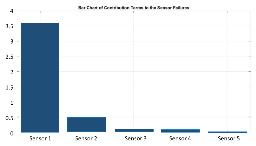 Having detected the sensor fault, the next step is to isolate the faulty sensor by conducting the contribution analysis. A bar chart showing the contributions from all five sensors is depicted in Figure 9, where and .