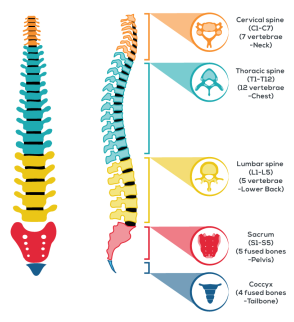 Spinal cord proves to be the most important element of human anatomy. It works as a backing for other segments of human body so that one can bend, twist and move easily. If this most essential segment of human structure is damaged in any way, a person cannot even stand up straight. Figure 1 illustrates the division of human spinal cord which consists of 33 individual bones known as vertebra. First 7 cervical vertebra (C1 ? C7) collectively form the neck, next 12 thoracic vertebra (T1 ? T12) form the chest, next 5 lumbar vertebra (L1 ? L5) form the lower back, next 4 sacral vertebra (S1 ? S4) form the pelvis and the last 4 fused vertebra form the tail bone of human structure are known as coccyx bones.