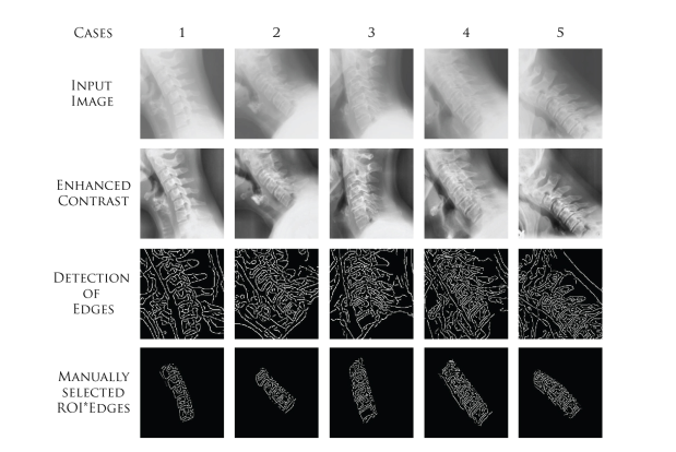 The edge detection step gives us the edges of whole input image, but the proposed technique requires edges for the C3−C7 only. so in this step we constructed the Region of Interest (ROI) covering the area of lower 5 cervical vertebrae only. Then this ROI is multiplied with the edges to get the edges of this area only. This is the last step of our Preprocessing stage.