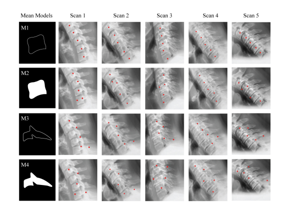 The creation of mean models is next stage of proposed technology. In this stage, 4 different template models M1, M2, M3 and M4 are constructed and shown in Figure 3. For the construction of these template models, 25 vertebra images for each template model are created using some drawing tools and then mean image is created using these 25 images. Eq. 1 is used to create mean model of each shape.