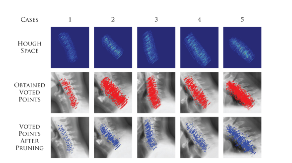 Now, for the detection process an Accumulator is created which represents the Hough Space and stores the points known as Voted points. These points mark the positions containing the template model. So, for each edge point obtained in preprocessing stage, gradient is computed and the corresponding value of R-Table stored as r(Φ) is added into the coordinates of edge point. Then the model check the resultant value if it is within the scope of Accumulator, if yes it increments the location of accumulator defined by this new point. All the voted points obtained by this process give the positioning of vertebra in X-rays. However, few outliers are also calculated by this process which are removed in next step.