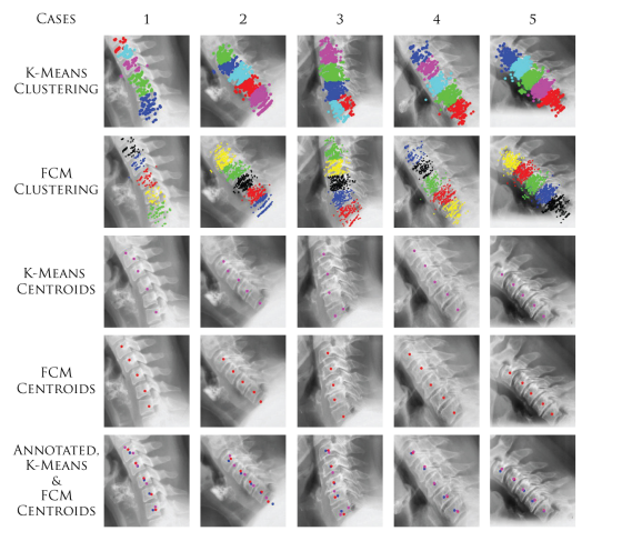 After the localization of vertebra from C3−C7, the next stage of proposed technique is to detect the centroids of each vertebra using the voted points obtained by all four template models. The centroid detection is performed using two different clustering techniques K-Means and Fuzzy C Means. Each clustering technique forms clusters using the voted points and then gives the centroid for each cluster representing each vertebra (C3−C7).