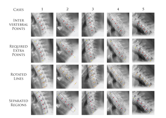 To extract the regions covering the area for each vertebra,intervertebral points are required. The intervertebral points are the location between the two vertebra. In our case we required total 6 intervertebral points, from which 4 are easy to find out by just calculating the mean of centroids from C3− C7 which we already have. Eq.6 represents the calculation of these 4 intervertebral points.
