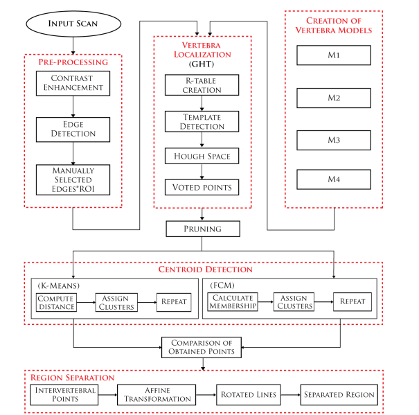 The presented technique comprises five stages to give a comparison of techniques for better localization and detection results along with separated regions for each vertebra. The flow chart of presented model is shown in Figure 4, representing the main steps of model including Preprocessing, Creation of Mean models, Vertebra Localization, Centroid detection and Region separation.