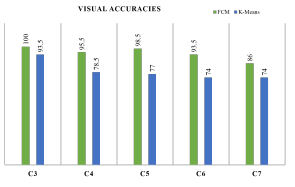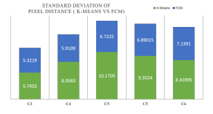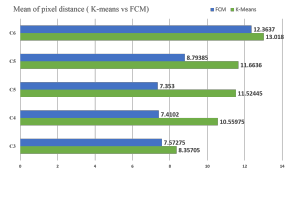 Figure 5 shows the calculated mean of the distance. The green bar shows the mean of k-means which is larger than FCM at every level, represented by blue bar. This parameter also marked FCM as a better