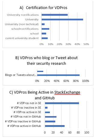 Another important aspect to consider in the experiment we conducted for analysing public profiles of VDPro is time constrains. As a result, we were only able to look at a limited number of vulnerability discovery professionals; there could thus be insights we did not acquire due to this limitation. We intend to do a large-scale analysis and survey as future work.