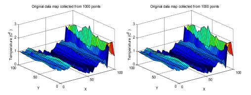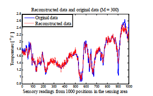 In Figure 6, both the true and the reconstructed data are shown together to illustrate the accuracy of the CS recovery algorithm with the number of CS measurements given by M = 300 stored at each sensor. The larger the number of measurements, the better the accuracy of the reconstruction.