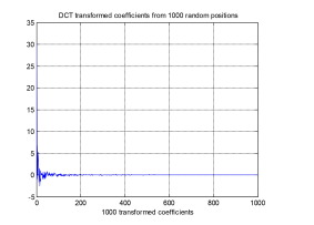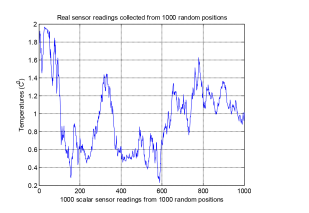 Ψ referred to as the sparsifying matrix, is an orthogonal basis of RN . If X is a k-sparse vector, Ψ is an identity matrix. Otherwise, Ψ can be chosen from another domain such as wavelet, DCT (discrete cosine transforms), etc. In order to verify this problem, Figures 3 and 4 are provided. All raw sensor readings from 1000 points of interest are shown in Figure 3. This real data is not sparse but it is highly correlated due to the positions next to each other. DCT Ψ matrix has been chosen to sparsify the real data. Figure 4 shows all the coefficients in DCT domain. We can see that signal energy would be reduced following Equation 5.