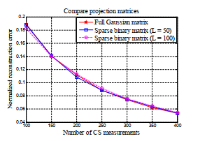 Figure 5 compares the ability to reconstruct data in the CS recovery process between three measurement matrices. Both sparse binary matrices with row weight L = 50 and 100 are shown to perform as well as the full Gaussian matrix which corresponds to full sampling.