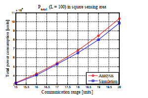 We chose the smallest transmission range R∗ = 15 and the corresponding convergence time I∗ = 94 for the optimal total power consumption for sensor communications in the network in both analysis and simulation which are shown in Figure 9.