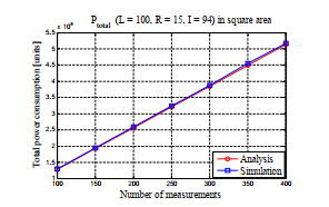 The total consumed power for sharing data for L sensors to achieve M converged CS measurements in the square sensing area can be written as![]()