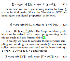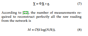 Compressed Sensing techniques [3, 4, 5] bring us amazing work to recover a compressible signal from undersampled random projections. They are also called measurements. A compressible vector signal X ∈ RN (X = [x1x2…xN ]T ) is k-sparse (X has k non zero elements) or dense but sparse in Ψ domain X = ΨΘ (where Θ is k-sparse vector) will be sampled and then recovered precisely with CS algorithm. The huge gain when we apply CS is the number of measurements are much less than the number of original vector values. Vector Y, called the measurement vector, contains data sampled from N sensor readings;