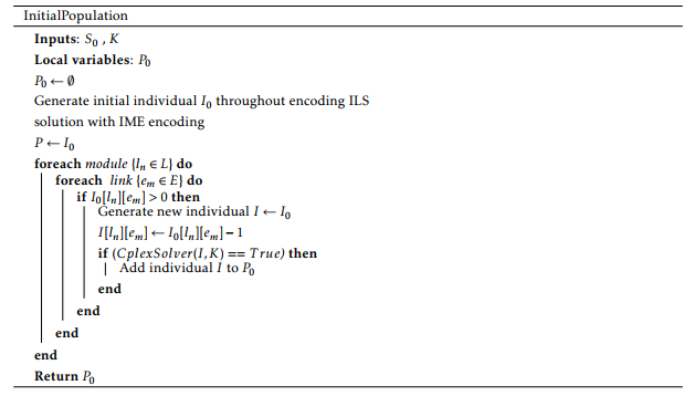 Creation of the initial population’s individuals columns represent the edges, and the rows represent the module types allocated on edges. At initial stage, our population contains only one individual I0. The other Individuals in the initial population are determined by applying some perturbations on the individual I0. A perturbation consists to delete one module from the I0’s edges. The complete procedure of generating the initial population is described in the following steps: