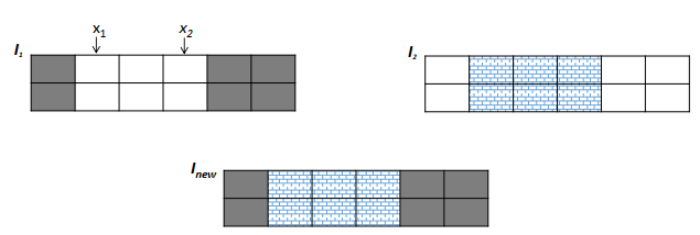 The crossover operator is responsible for combining two chromosomes so that a new offspring chromosome can be generated. In our proposition, we used a two point crossover: we randomly chose two integers in the individual length interval (0 < x1 ≤ x2 ≤ m) and two individuals (I1 and I2) in the current population, then we apply the two-point crossover operator to generate a new individual as shown in Figure 3. Typically, a new individual Inew is generated by selecting the modules of edges in (e1,ex1] ∪ [ex2,em) from I1 and (ex1,ex2) from I2.