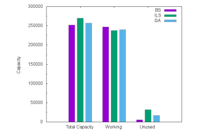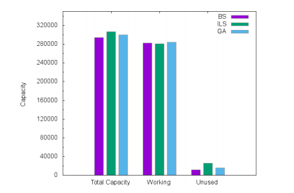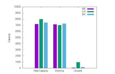 Figures 6, 7 and 8 show the allocated capacities and their usage for Atlanta, France and Germany50 networks respectively. We compared the total installed link capacities, the total working capacities and the total unused capacities for BS, ILS and GA solutions. We remark that the total installed link capacities in ILS and GA are more larger than the BS ones. This justifies the cost gap. On the other hand, ILS uses fewer working capacities than BS because ILS wastes and over-allocates module resources, leading to efficient routing. Indeed, instead of splitting flows and exploring the small unused capacities on links, ILS routes the majority of demands on shortest paths. With GA, the CPLEX optimizer tries to exploit the residual quantities on the allocated modules to route the flows. This leads to a bifurcation of demands on multiple paths that could be quite long, though routing costs slightly limit the path lengths.