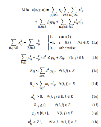 The multicommodity flow problem formulation presented in the linear programming (2) is obtained by replacing the vectors (y,n) in the original CNDP formulation (1) by their fixed values (y,¯ n¯). In this reformulation, the objective function aims to minimise the routing of flows. Constraints (2a) are flow conservation equations. For simplicity and efficiency, we delete the variables R by replacing the constraints (2b), (2c), (2d) and (2f) by the following constraints (3a):