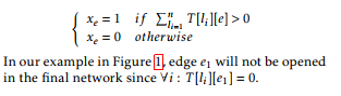 In our example in Figure 1, edge e1 will not be opened in the final network since ∀i : T [li][e1] = 0.