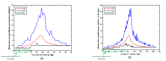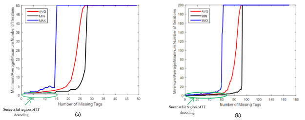 To illustrate the impact of the proposed early stopping criterion on decoding time, Figure 4 shows iteration numbers which are taken for various missing amounts to be compared to those of the conventional IT decoding depicted in Figure 1. One can observe that the proposed stopping criterion greatly reduces the average number of iterations in the region where IT decoding is not successful. Figure 4 shows that undecodable blocks need at most 17 and 33 iterations, respectively, when recovering more than 15 and 70 missing tags from a group of 49 and 169.