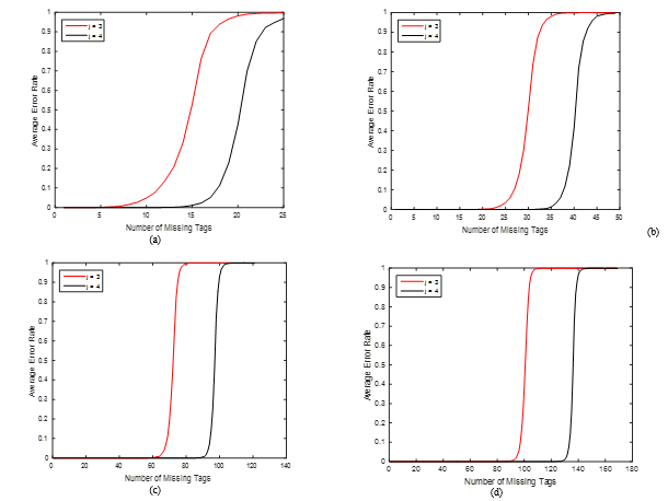 To illustrate the performance of the improved HB decoding in recovering missing tags, Figure 2 shows the average error rate as a function of the number of missing tags for different values of group sizes n where the column weight j varies between 3 and 4. It can be clearly shown that increasing j greatly increases the performance of the improved HB decoding in recovering missing tags. The main reason for this behaviour is that a large value of j produces a large number of rows and thus increases the rank of the matrix. For example, if five tags are missing from a group of n = 25, all their identifiers can be recovered with at least j = 3 under the improved HB decoding. However, if ten identifiers are missing, the column weight needs to be adjusted to 4 in order to achieve 100% reliable recovery (0% error rate). Table 1 compares the missing recovery capabilities of the simulated PEG-based method under the improved HB decoding algorithm with other extended grouping methods presented in [2–4]. It is clear that the improved algorithm achieves significant missing recovery enhancements compared to other extended grouping methods. It can be concluded from the results that the improved HB decoding achieves the optimal missing recovery capabilities of full GE decoding, since the remaining systems of IT decoding containing short cycles are solved with GE decoding. The results also reveal that the recovery performance of the improved HB decoding increases by increasing the group size. This results from the fact that the PEG-based method accounts for short cycles in Tanner graphs by maximizing the local girth, i.e. the length of the shortest cycle, at variable nodes, which is more achievable when the group size is large [1]. Applying the improved HB decoding to groups of 25 and 49 tags, for example, results in the recovery of missing tags of up to 48% and 65%, respectively, of the group size, with a 0% error rate. On the other hand, for groups of 121 and 169 tags, the recovery capabilities increase to 72% and 74.5%, respectively.
