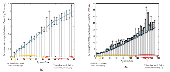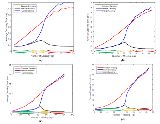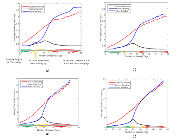 - Decoding time measurements as a function of the number of missing tags to compare two cases, one where IT decoding is successful and the other where IT decoding fails and GE is needed.