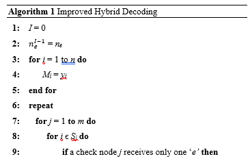 even for a large number of missing tags. When GE decoding is utilized, the size of the simplified system should also be as small as possible. This suggests a stopping criterion for the PEG-based method which permits partial decoding of undecodable blocks up to a point where IT decoding cannot recover any missing tag identifiers. The proposed criterion can distinguish between decodable and undecodable blocks. It does not cause any computation overheads, as it utilizes the information available during the decoding process. Algorithm 1 outlines the improved HB decoding algorithm. The input is the received codeword y = [y1, y2, … , yn] of the transmitted codeword x = [ x1, x2, … , xn] where xi ∈ {0,1} and yi ∈ {0, 1, e} for i = 1 … n. The output is M = [M1, … , Mn] where Mi ∈ {0, 1, e}. Let Sj denote the set of symbols in the j-th check equation of the code, ne is the number of erasures at the input to the decoder, and Ej,i is the outgoing message from the check node j to the variable node i. The improved algorithm is based on the observation of the checksum of erasure symbols at the end of each iteration I. It halts the decoding process if the checksum remains unchanged or does not decrease within two consecutive decoding iterations, as in Step 24. This results from the observation that decodable blocks exhibit a consistent decrease in checksum values.