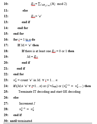 The IT decoding iterates the above process until all the erasure symbols are recovered successfully or until a predetermined maximum number of iterations (Imax) has passed without successful decoding [15].