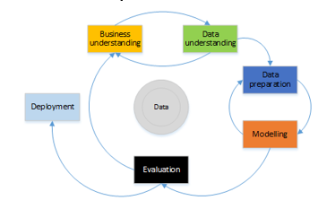 The CRISP-DM methodology structures the life cycle of a data mining project in six phases [3], which interacts with each other in an iterative way during development of the project as shown in Figure 1. The methodology in a general description is organized in phases, where each phase is structured in several generic tasks of second level, and these make a projection towards specific tasks that described the actions that should be developed [3]. E.g., if the second level has the generic task “data cleaning”, the third level indicates the tasks that have to be developed for a specific case, such as “numerical data cleaning” or “categorical data cleaning”. Finally, the fourth level includes a set of actions, decisions and results of the data mining project in question.Within the set of business intelligence technologies is data mining, which in itself is a phase of the KDD process, and is responsible for the data preparation and the interpretation of the results. Keeping in mind that KDD is a process that has a high level of complexity, it was necessary the use of methodologies that allow a systematic approach in the construction of data mining projects, today there are two methodologies for the information treatment that are avant-garde in their models. The SAS company suggests the use of SEMMA methodology, likewise in 1999, a large consortium of European companies, NCR (Denmark), AG (Germany), SPSS (England) and OHRA (Netherlands) joined forces to develop a free distribution methodology called CRISP-DM (Cross Industry Standard Process for Data Mining) [2]. Those methodologies structure the data mining project in phases that are interrelated, converting the process into iterative and interactive.