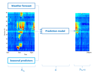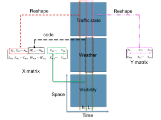 | the inputs’ predictors, including the observed elements of the spatiotemporal state submatrix at the time interval , time of day, day of week, and the forecasted weather conditions and visibility | |