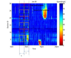 The selected I-66 eastbound study site is located between Gainesville and Arlington in Northern Virginia. There are 36 segments along the selected 30.7-mile stretch of freeway. This corridor has four lanes in each direction, with the leftmost lane designated as an HOV-2 lane during morning and afternoon peak hours. This is the major commuting corridor between Northern Virginia and Washington, DC. INRIX probe data from 2011 to 2013 were used to develop the prediction models, and data reduction was conducted to extract the daily traffic speed matrices. One-minute average speeds (or travel times) are available in the raw data for each roadway segment. Initially, the daily speed data were sorted by time and location from the raw data into a two-dimensional matrix. In order to reduce the stochastic noise and measurement error, the speed matrices were aggregated by 15-minute intervals. The missing data in the aggregated speed matrices were estimated using the moving average from a 3 × 3 window.